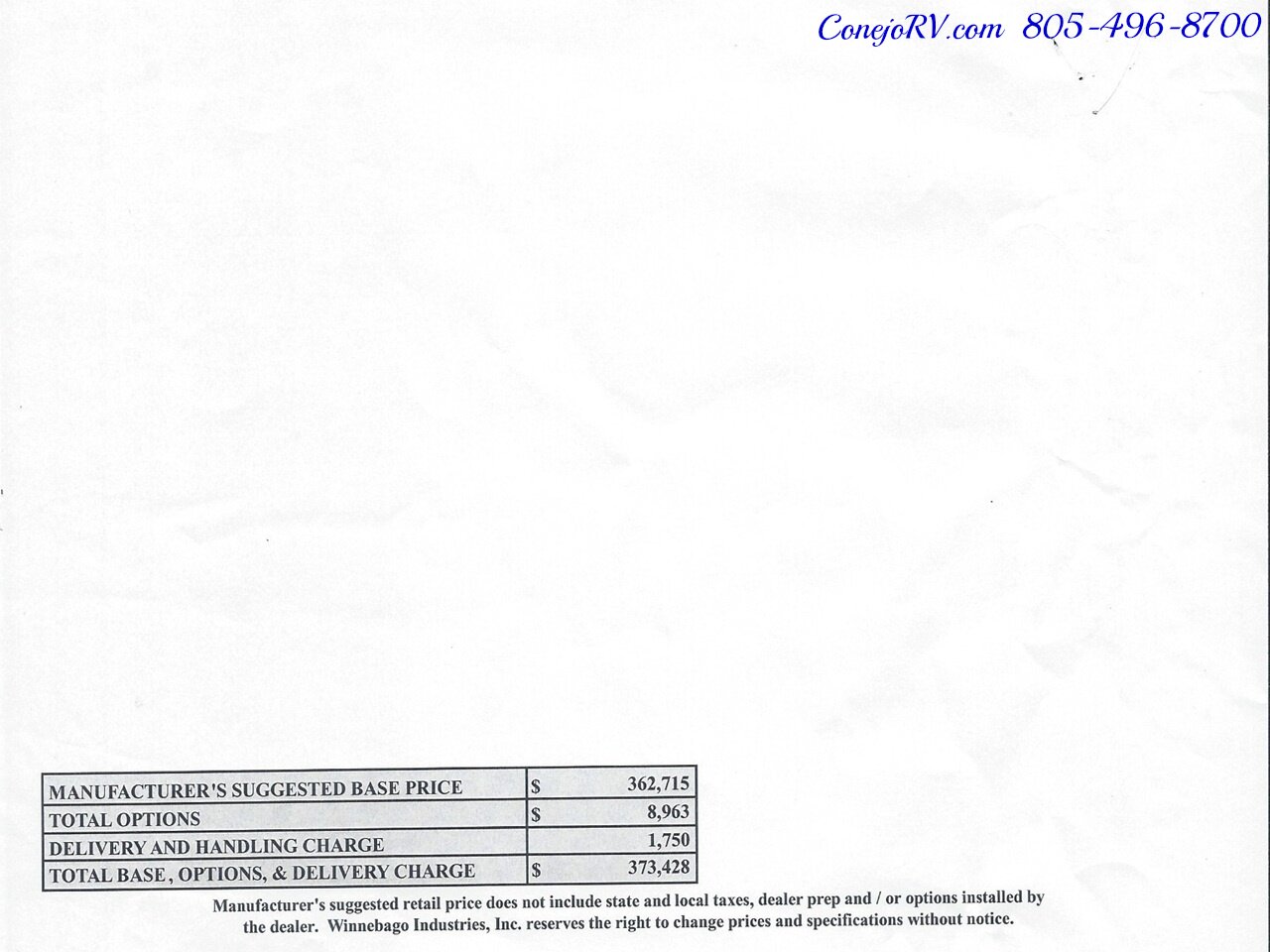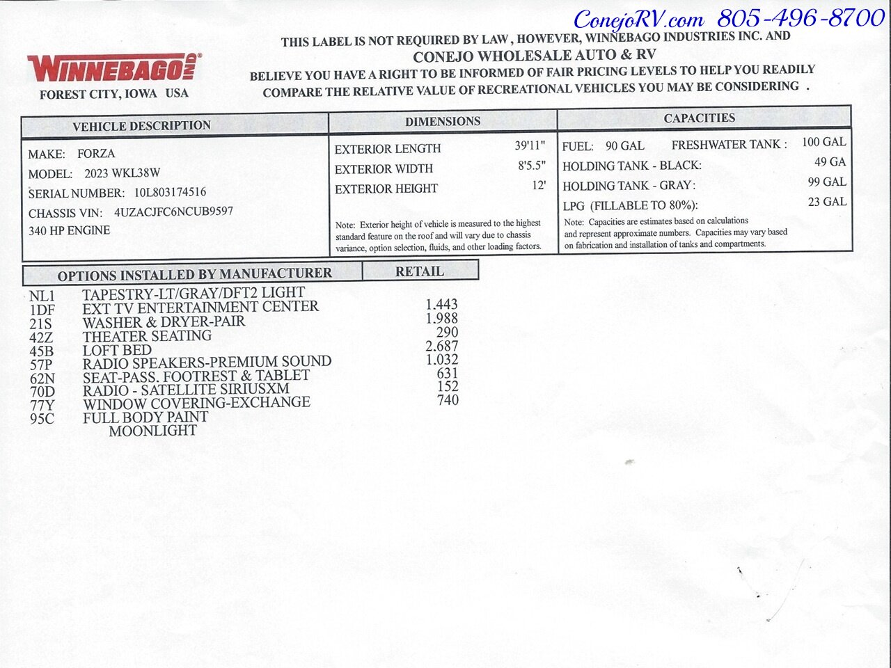 2023 Winnebago Forza 38W Triple Slide Outs Bunkhouse Loft Bed 2 Bath Cummins Turbo Diesel 45k Miles **159,990** Freightliner XCS Full Air Chassis, 340-hp Cummins® ISB 6.7L Turbo Diesel, Allison 6 Speed Automatic Transmission, Air Brakes w/ABS, Onan Quiet 6.0KW Diesel Generator, 2KW Inverter, Automatic Hydraulic Levelers, Private Rear Bedroom with Walk-Around Island Queen Bed, Mid Coach Bunkbeds & Private Full Bath with Porcelain Toilet, Vanity/Sink, Walk-in Shower with Glass Enclosure, Second Full Bath With Sink, Shower and Toilet, Washer and Dryer, Driver Side Slide Out With Nice Kitchen with Corian Countertops and Matching Sink Cover, Glass Stove Cover, Residential Refrigerator/Freezer, Icemaker, Microwave, Pantry, , Large Living Room Flat Screen TV, Electric Fireplace, Large Living Room Super-Slide with Ultra-Leather Convertible Booth Dinette and Ultra-Leather Theater Seats, Bunk Beds, Front Power Loft Bed, Sleeps up to 6, Ultra-Leather Swivel/Reline Captains Chairs, Passenger Flip Up Desk/Table, Radio/Rearview Monitor System w/9" LCD color Touch Screen, Bluetooth, Sirius-XM®-ready, USB input, Rear Back Up Camera, Power Patio Awning, Full Basement Storage with Pass-Thru, Outdoor Entertainment Center With Flat Screen TV, 100 Gallons Fresh Water, Dual Ducted Roof Airs with Heat Pumps, 50 Amp Storage, Tow Package, High Gloss Full Body Paint, 45k Original Miles, Like New Condition, ***Only $159,990*** We have some fantastic financing and take trades also! It is our #1 goal that your experience with our company is an enjoyable one with our staff of industry professionals, Conejo Wholesale Auto & RV, Exclusive Ventura County Dealer For Winnebago Navion, Revel, Solis, Ekko, and Travato, All Storyteller Products, Outside Van Syncline and Approach, Tiffin GH1, All Roadtrek Products, We Also Carry Some Quality Pre-Owned Motorhomes which come with Our 45 Day/1000 Mile In-House Warranty at No Charge, Conejo RV, 661 E. Thousand Oaks Blvd, Thousand Oaks, CA 91360, 805-496-8700, www.ConejoRV.com Open 7 Days, 9am to 6pm, All Coaches Fully Inspected, Serviced and Detailed, Come Experience the No Pressure No Haggle Sales Approach at Conejo RV, We Also Buy Clean Late Model Coaches, 1 Year Free Camping Membership Included Ask For Details! (***plus tax & license fees***)